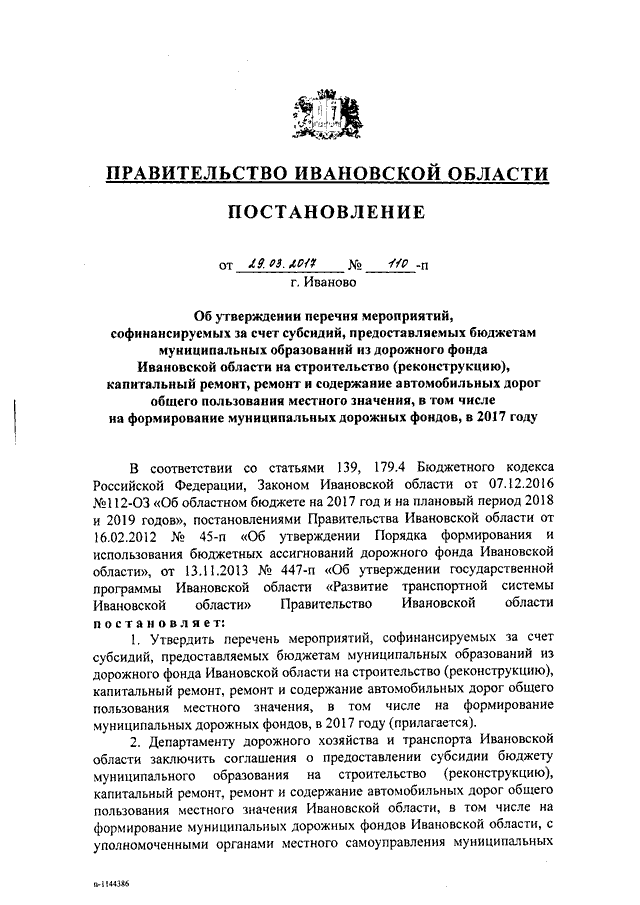 Постановление Правительства Ивановской области от 29.03.2017 N 110-п "Об утверждении перечня мероприятий, софинансируемых за счет субсидий, предоставляемых бюджетам муниципальных образований из дорожного фонда Ивановской области на строительство (реконструкцию), капитальный ремонт, ремонт и содержание автомобильных дорог общего пользования местного значения, в том числе на формирование муниципальных дорожных фондов, в 2017 году"