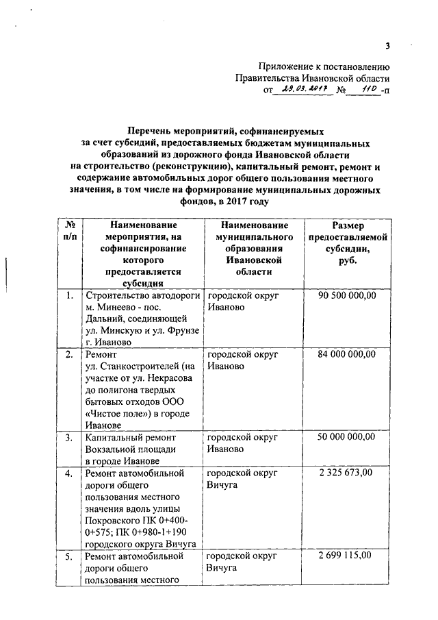 Постановление Правительства Ивановской области от 29.03.2017 N 110-п "Об утверждении перечня мероприятий, софинансируемых за счет субсидий, предоставляемых бюджетам муниципальных образований из дорожного фонда Ивановской области на строительство (реконструкцию), капитальный ремонт, ремонт и содержание автомобильных дорог общего пользования местного значения, в том числе на формирование муниципальных дорожных фондов, в 2017 году"