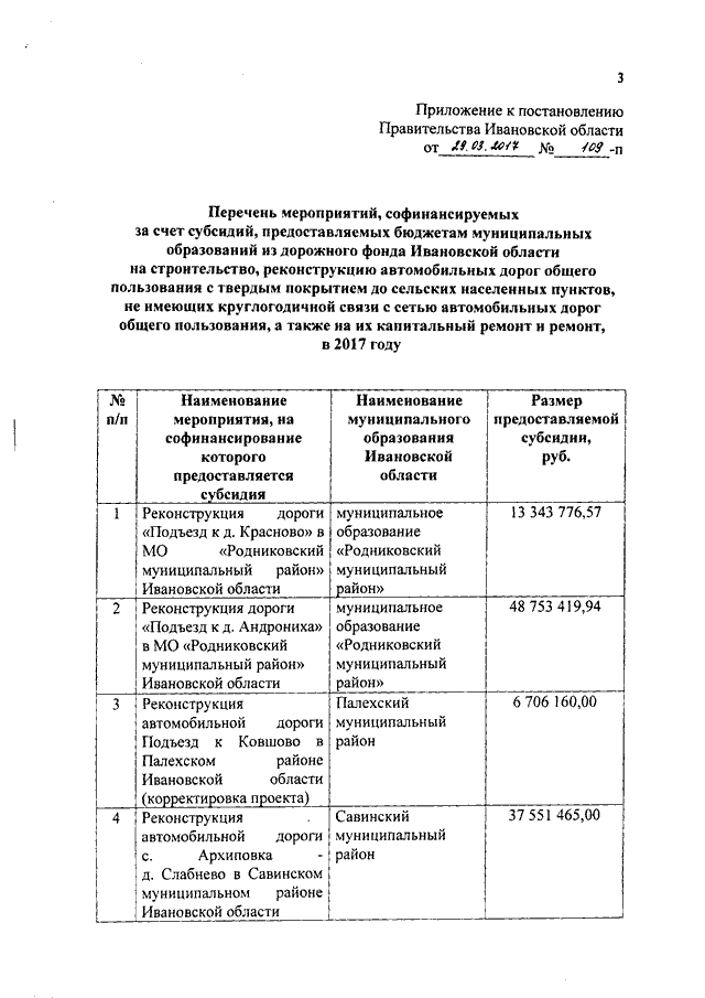 Постановление Правительства Ивановской области от 29.03.2017 N 109-п "Об утверждении перечня мероприятий, софинансируемых за счет субсидий, предоставляемых бюджетам муниципальных образований из дорожного фонда Ивановской области на строительство, реконструкцию автомобильных дорог общего пользования местного значения с твердым покрытием до сельских населенных пунктов, не имеющих круглогодичной связи с сетью автомобильных дорог общего пользования, а также на их капитальный ремонт и ремонт, в 2017 году"