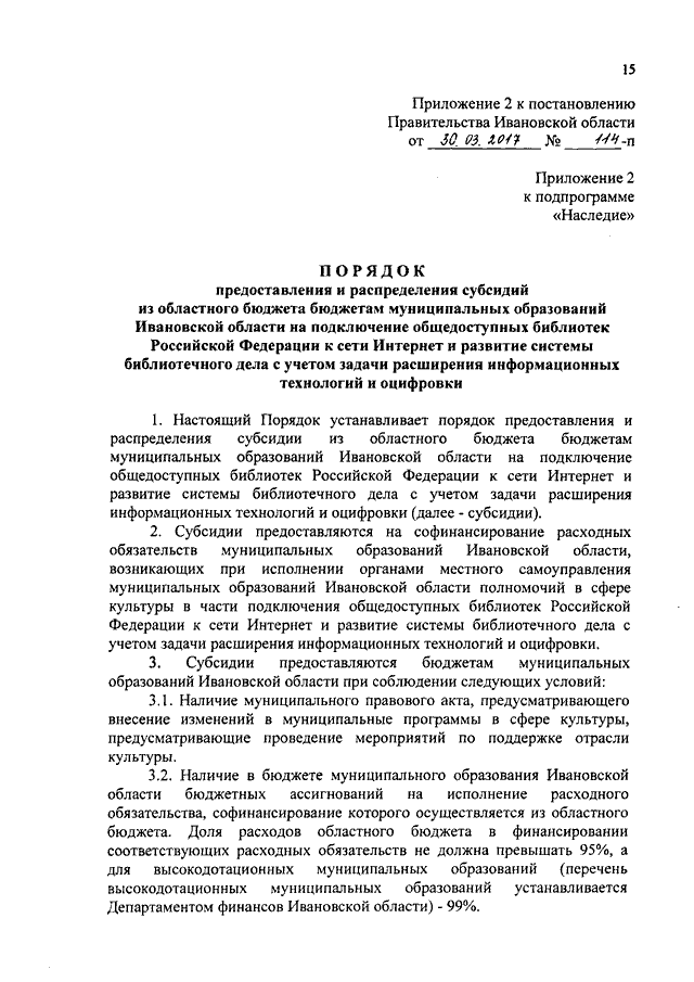 Постановление Правительства Ивановской области от 30.03.2017 N 114-п "О внесении изменений в постановление Правительства Ивановской области от 13.11.2013 N 453-п "Об утверждении государственной программы Ивановской области "Культура Ивановской области" (вместе с "Порядком предоставления и распределения субсидий из областного бюджета бюджетам муниципальных образований Ивановской области на комплектование книжных фондов библиотек муниципальных образований", "Порядком предоставления и распределения субсидий из областного бюджета бюджетам муниципальных образований Ивановской области на подключение общедоступных библиотек Российской Федерации к сети Интернет и развитие системы библиотечного дела с учетом задачи расширения информационных технологий и оцифровки", "Порядком предоставления и распределения субсидий из областного бюджета бюджетам муниципальных образований Ивановской области на государственную поддержку муниципальных учреждений культуры", "Порядком предоставления и распределения субсидий из областного бюджета бюджетам муниципальных образований Ивановской области на государственную поддержку лучших работников муниципальных учреждений культуры, находящихся на территории сельских поселений")
