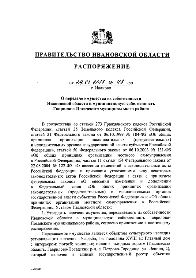 Распоряжение Правительства Ивановской области от 29.03.2017 N 43-рп "О передаче имущества из собственности Ивановской области в муниципальную собственность Гаврилово-Посадского муниципального района"
