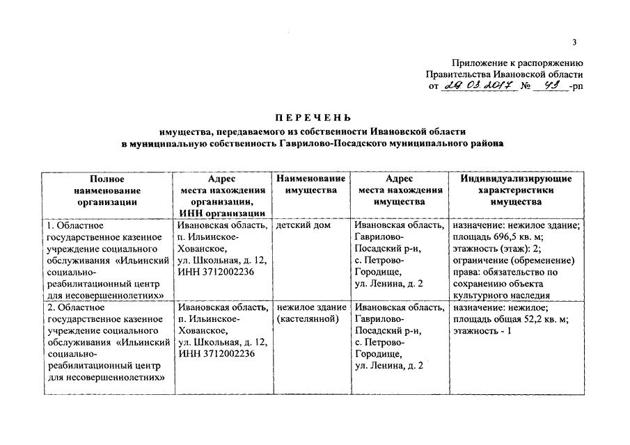 Распоряжение Правительства Ивановской области от 29.03.2017 N 43-рп "О передаче имущества из собственности Ивановской области в муниципальную собственность Гаврилово-Посадского муниципального района"