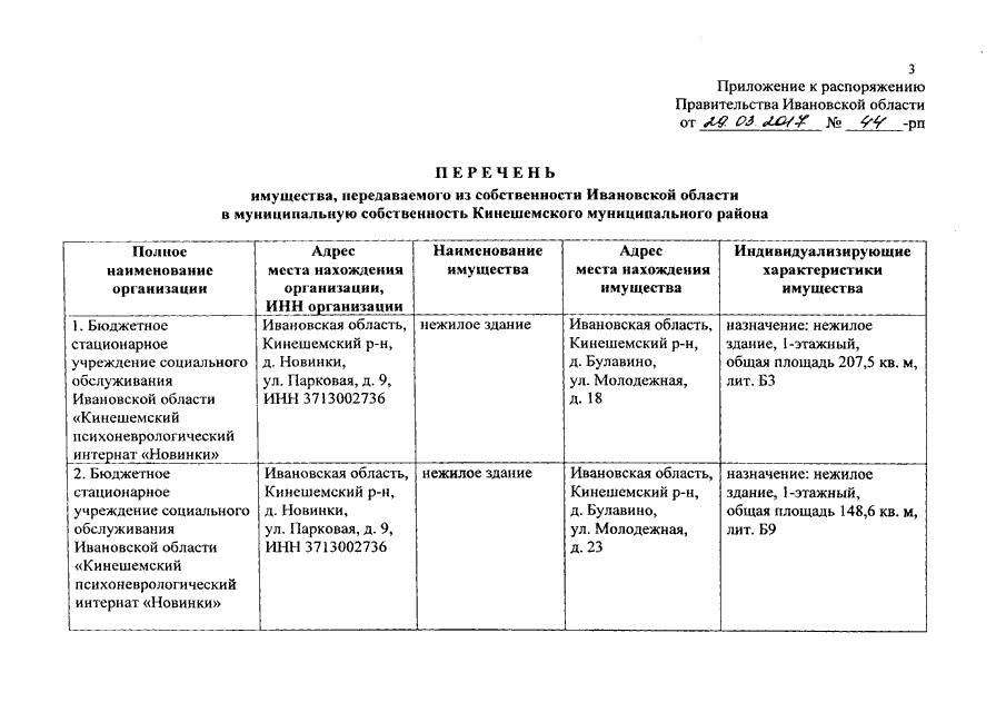 Распоряжение Правительства Ивановской области от 29.03.2017 N 44-рп "О передаче имущества из собственности Ивановской области в муниципальную собственность Кинешемского муниципального района"