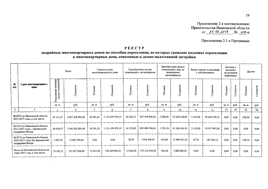 Постановление Правительства Ивановской области от 31.03.2017 N 117-п "О внесении изменений в постановление Правительства Ивановской области от 15.04.2013 N 134-п "Об утверждении региональной адресной программы "Переселение граждан из аварийного жилищного фонда на территории Ивановской области на 2013 - 2017 годы" (вместе с "Перечнем аварийных многоквартирных домов, из которых граждане подлежат переселению в многоквартирные дома, отнесенные к домам малоэтажной застройки", "Реестром аварийных многоквартирных домов по способам переселения, из которых граждане подлежат переселению в многоквартирные дома, отнесенные к домам малоэтажной застройки")