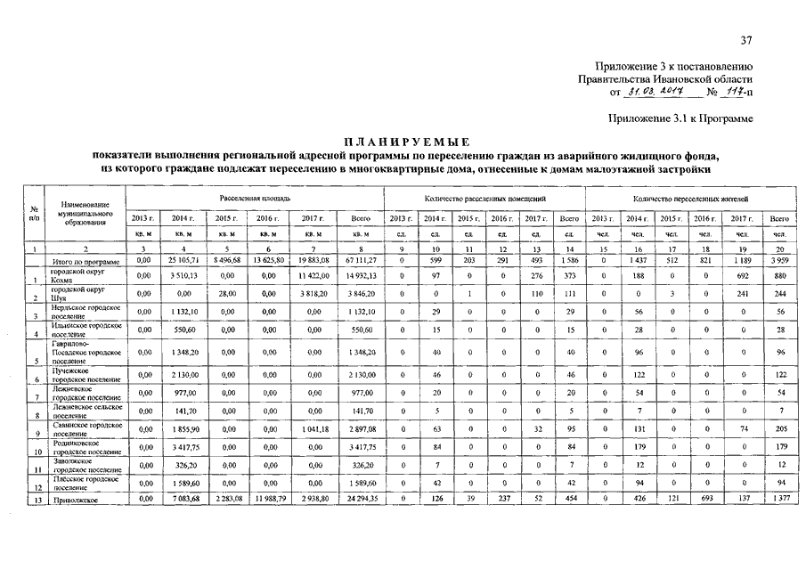 Постановление Правительства Ивановской области от 31.03.2017 N 117-п "О внесении изменений в постановление Правительства Ивановской области от 15.04.2013 N 134-п "Об утверждении региональной адресной программы "Переселение граждан из аварийного жилищного фонда на территории Ивановской области на 2013 - 2017 годы" (вместе с "Перечнем аварийных многоквартирных домов, из которых граждане подлежат переселению в многоквартирные дома, отнесенные к домам малоэтажной застройки", "Реестром аварийных многоквартирных домов по способам переселения, из которых граждане подлежат переселению в многоквартирные дома, отнесенные к домам малоэтажной застройки")