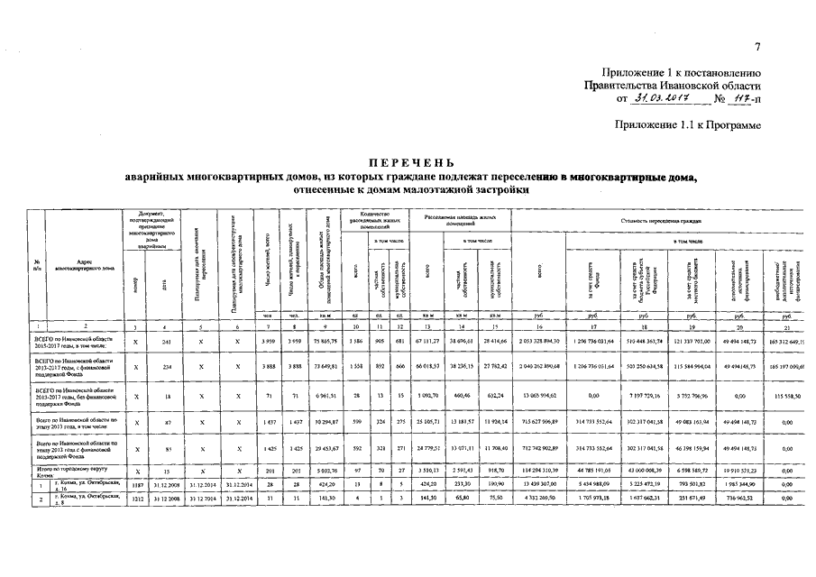 Постановление Правительства Ивановской области от 31.03.2017 N 117-п "О внесении изменений в постановление Правительства Ивановской области от 15.04.2013 N 134-п "Об утверждении региональной адресной программы "Переселение граждан из аварийного жилищного фонда на территории Ивановской области на 2013 - 2017 годы" (вместе с "Перечнем аварийных многоквартирных домов, из которых граждане подлежат переселению в многоквартирные дома, отнесенные к домам малоэтажной застройки", "Реестром аварийных многоквартирных домов по способам переселения, из которых граждане подлежат переселению в многоквартирные дома, отнесенные к домам малоэтажной застройки")