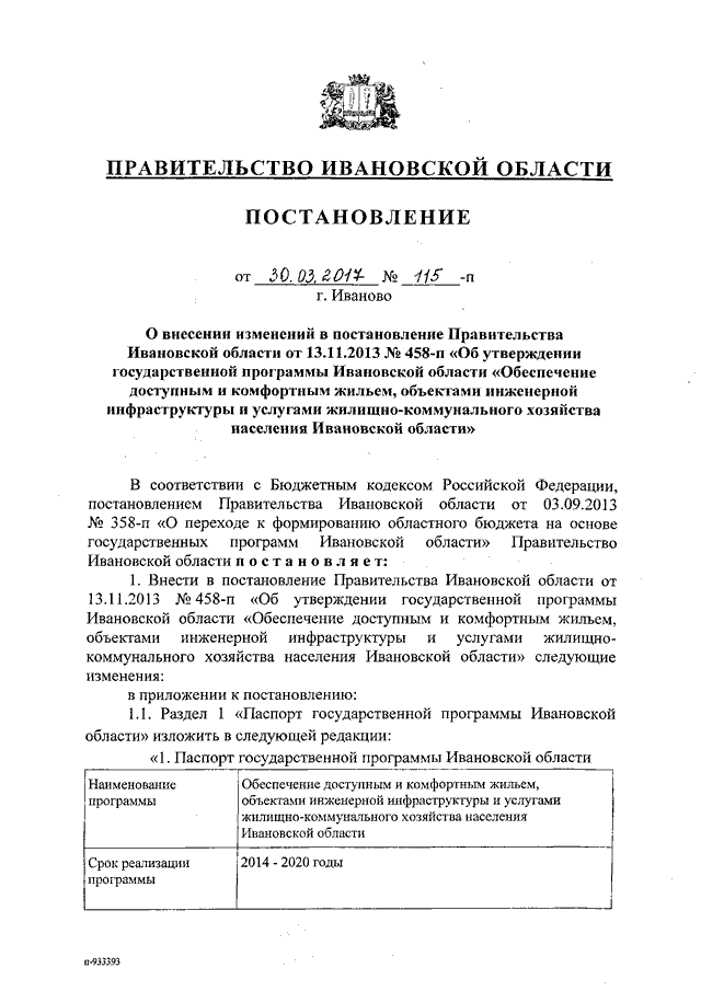 Постановление Правительства Ивановской области от 30.03.2017 N 115-п "О внесении изменений в постановление Правительства Ивановской области от 13.11.2013 N 458-п "Об утверждении государственной программы Ивановской области "Обеспечение доступным и комфортным жильем, объектами инженерной инфраструктуры и услугами жилищно-коммунального хозяйства населения Ивановской области" (вместе с "Подпрограммой "Обеспечение жильем отдельных категорий граждан", "Подпрограммой "Реализация мероприятий по обеспечению населения Ивановской области теплоснабжением, водоснабжением и водоотведением", "Подпрограммой "Предупреждение аварийных ситуаций на объектах ЖКХ Ивановской области", "Подпрограммой "Переселение из аварийного жилищного фонда", "Подпрограммой "Повышение эффективности организации строительства, реконструкции и капитального ремонта объектов, находящихся в собственности Ивановской области", "Подпрограммой "Развитие жилищно-коммунальной сферы", "Подпрограммой "Развитие газификации Ивановской области", "Подпрограммой "Обеспечение жильем молодых семей", "Подпрограммой "Государственная поддержка граждан в сфере ипотечного жилищного кредитования", "Подпрограммой "Стимулирование развития жилищного строительства")
