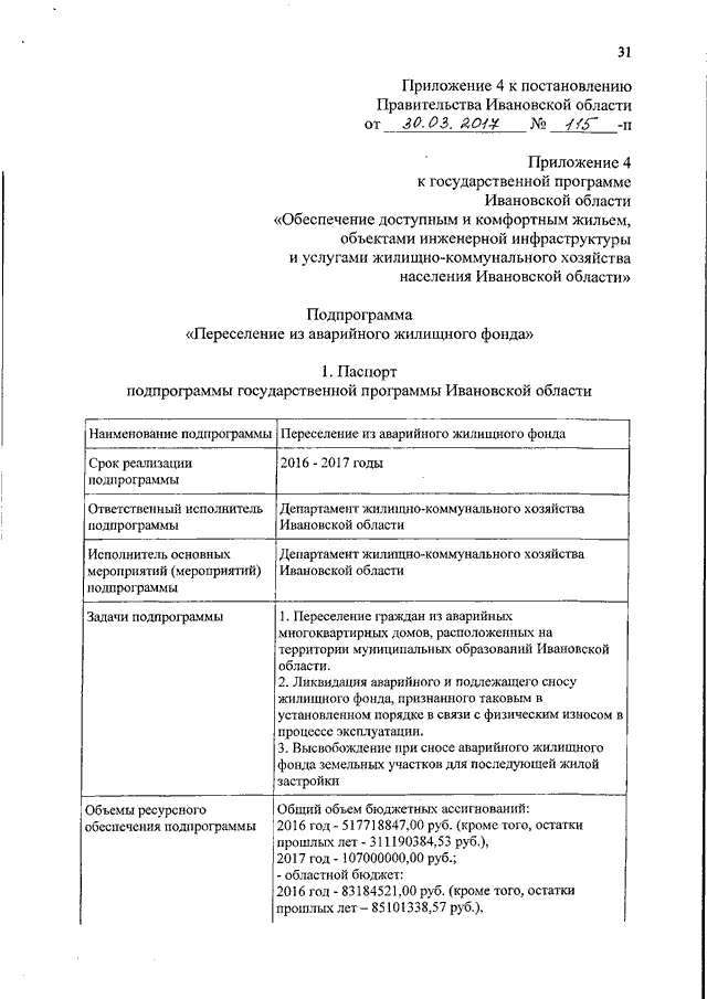 Постановление Правительства Ивановской области от 30.03.2017 N 115-п "О внесении изменений в постановление Правительства Ивановской области от 13.11.2013 N 458-п "Об утверждении государственной программы Ивановской области "Обеспечение доступным и комфортным жильем, объектами инженерной инфраструктуры и услугами жилищно-коммунального хозяйства населения Ивановской области" (вместе с "Подпрограммой "Обеспечение жильем отдельных категорий граждан", "Подпрограммой "Реализация мероприятий по обеспечению населения Ивановской области теплоснабжением, водоснабжением и водоотведением", "Подпрограммой "Предупреждение аварийных ситуаций на объектах ЖКХ Ивановской области", "Подпрограммой "Переселение из аварийного жилищного фонда", "Подпрограммой "Повышение эффективности организации строительства, реконструкции и капитального ремонта объектов, находящихся в собственности Ивановской области", "Подпрограммой "Развитие жилищно-коммунальной сферы", "Подпрограммой "Развитие газификации Ивановской области", "Подпрограммой "Обеспечение жильем молодых семей", "Подпрограммой "Государственная поддержка граждан в сфере ипотечного жилищного кредитования", "Подпрограммой "Стимулирование развития жилищного строительства")