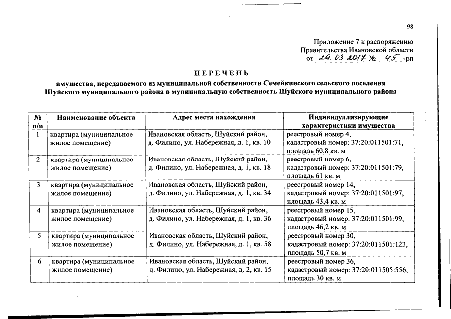 Распоряжение Правительства Ивановской области от 29.03.2017 N 45-рп "О разграничении имущества, находящегося в муниципальной собственности, между Шуйским муниципальным районом и сельскими поселениями, входящими в его состав, в связи с изменением перечня вопросов местного значения сельского поселения"