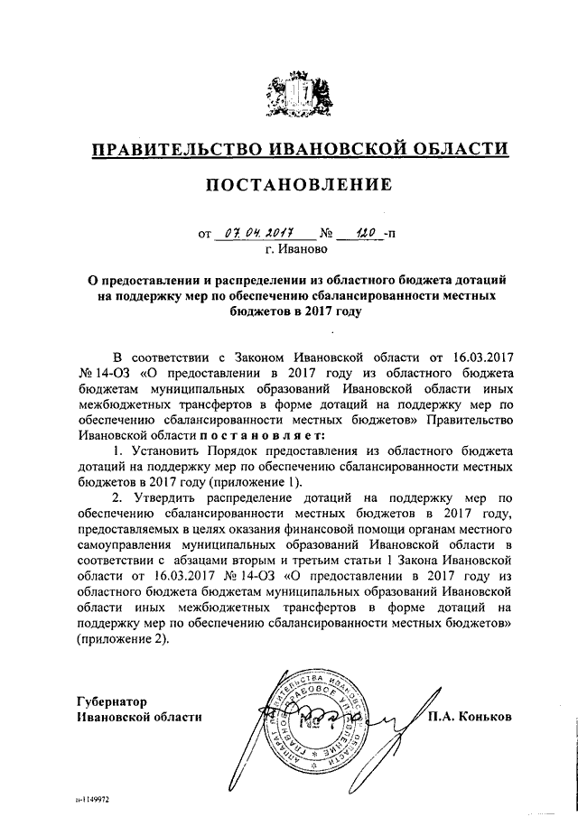 Постановление Правительства Ивановской области от 07.04.2017 N 120-п "О предоставлении и распределении из областного бюджета дотаций на поддержку мер по обеспечению сбалансированности местных бюджетов в 2017 году" (вместе с "Порядком предоставления из областного бюджета дотаций на поддержку мер по обеспечению сбалансированности местных бюджетов в 2017 году")