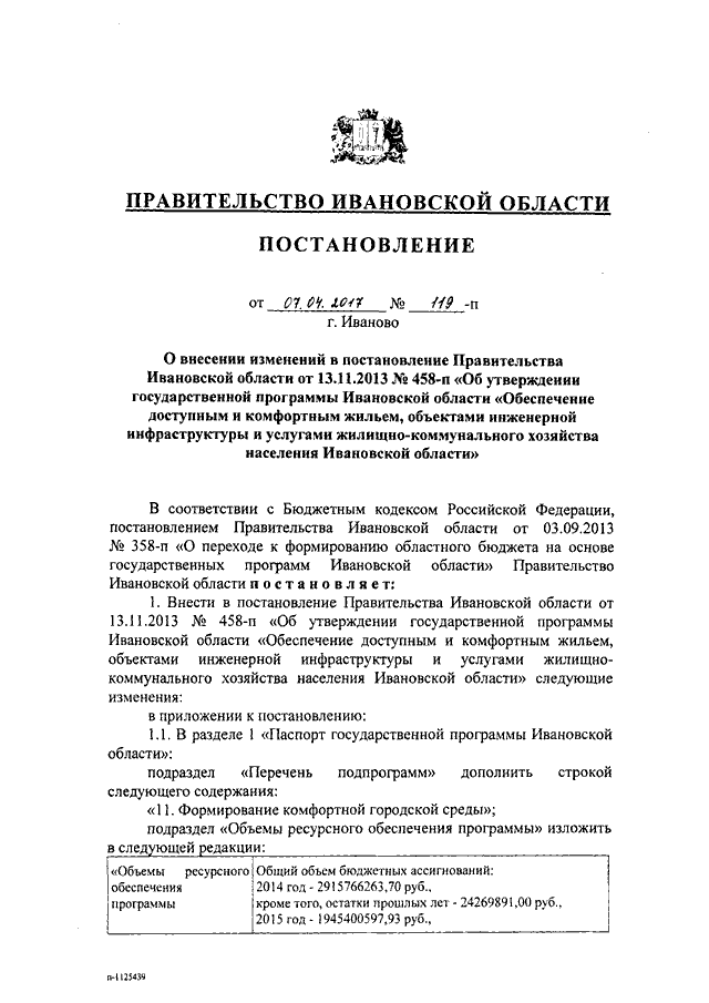 Постановление Правительства Ивановской области от 07.04.2017 N 119-п "О внесении изменений в постановление Правительства Ивановской области от 13.11.2013 N 458-п "Об утверждении государственной программы Ивановской области "Обеспечение доступным и комфортным жильем, объектами инженерной инфраструктуры и услугами жилищно-коммунального хозяйства населения Ивановской области" (вместе с "Порядком предоставления и распределения субсидий бюджетам муниципальных образований на подготовку проектов внесения изменений в документы территориального планирования, правила землепользования и застройки", "Подпрограммой "Формирование комфортной городской среды")