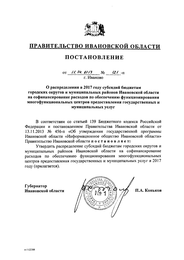 Постановление Правительства Ивановской области от 11.04.2017 N 121-п "О распределении в 2017 году субсидий бюджетам городских округов и муниципальных районов Ивановской области на софинансирование расходов по обеспечению функционирования многофункциональных центров предоставления государственных и муниципальных услуг"