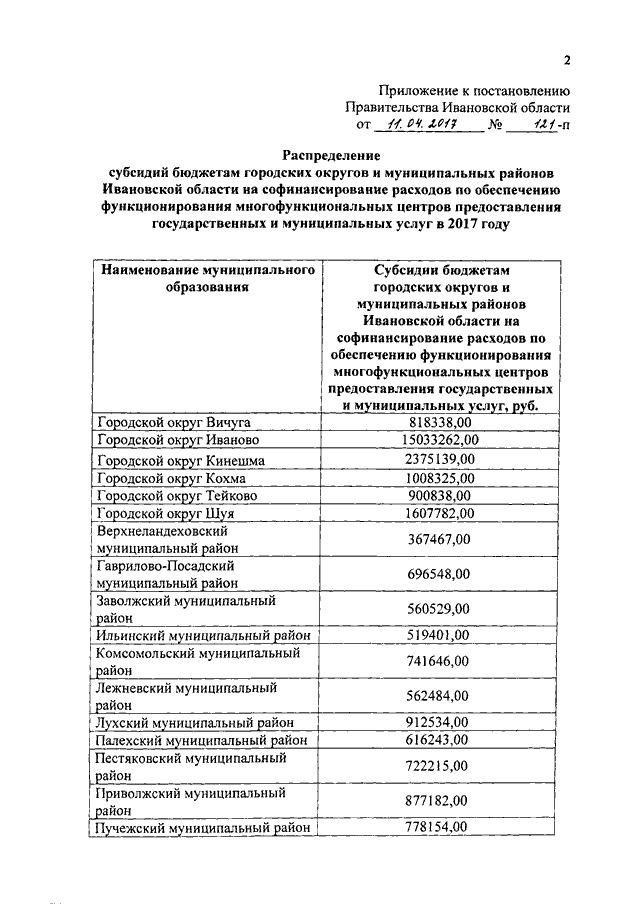Постановление Правительства Ивановской области от 11.04.2017 N 121-п "О распределении в 2017 году субсидий бюджетам городских округов и муниципальных районов Ивановской области на софинансирование расходов по обеспечению функционирования многофункциональных центров предоставления государственных и муниципальных услуг"