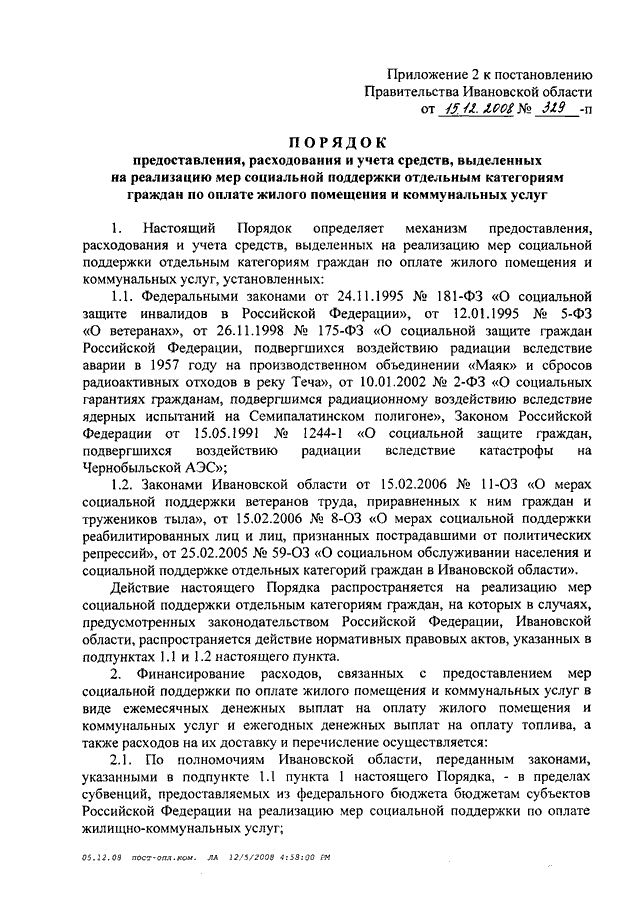 Постановление Правительства Ивановской области от 15.12.2008 N 329-п "Об утверждении Правил предоставления ежемесячной денежной выплаты на оплату жилого помещения и коммунальных услуг и ежегодной денежной выплаты на оплату топлива, расчета и перерасчета их размера отдельным категориям граждан, проживающим в Ивановской области, и Порядка предоставления, расходования и учета средств, выделенных на реализацию мер социальной поддержки отдельным категориям граждан по оплате жилого помещения и коммунальных услуг"
