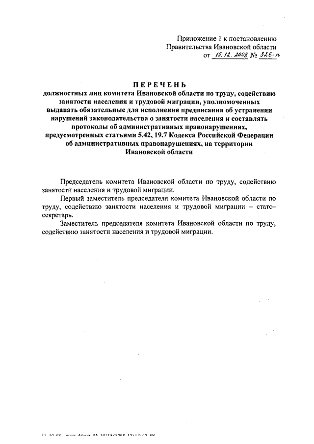 Постановление Правительства Ивановской области от 15.12.2008 N 326-п "Об исполнении работодателями Закона Ивановской области от 12.05.2006 N 44-ОЗ "О квотировании рабочих мест для инвалидов на предприятиях, в учреждениях и организациях в Ивановской области" (вместе с "Перечнем должностных лиц комитета Ивановской области по труду, содействию занятости населения и трудовой миграции, уполномоченных выдавать обязательные для исполнения предписания об устранении нарушений законодательства о занятости населения и составлять протоколы об административных правонарушениях, предусмотренных статьями 5.42, 19.7 Кодекса Российской Федерации об административных правонарушениях, на территории Ивановской области")