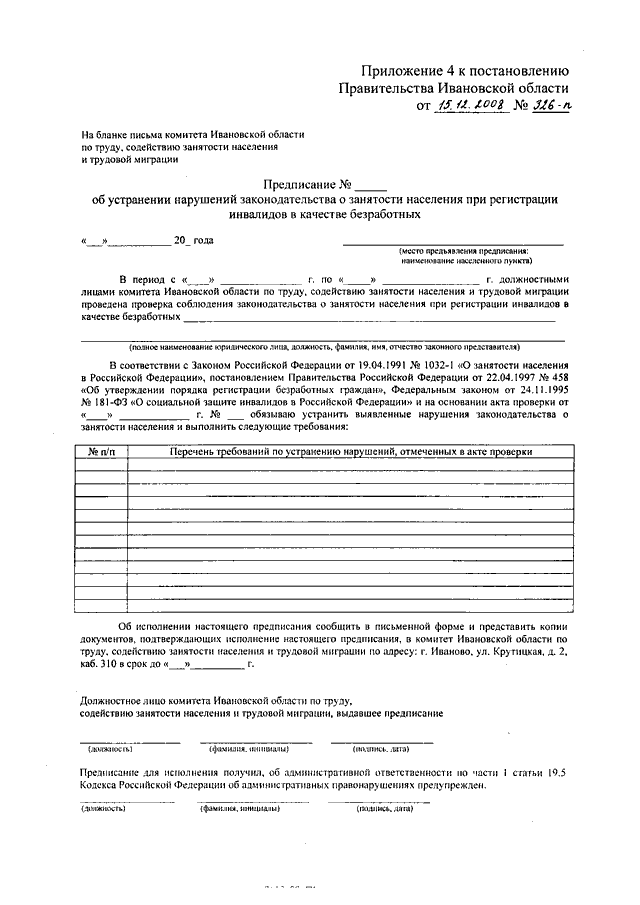 Постановление Правительства Ивановской области от 15.12.2008 N 326-п "Об исполнении работодателями Закона Ивановской области от 12.05.2006 N 44-ОЗ "О квотировании рабочих мест для инвалидов на предприятиях, в учреждениях и организациях в Ивановской области" (вместе с "Перечнем должностных лиц комитета Ивановской области по труду, содействию занятости населения и трудовой миграции, уполномоченных выдавать обязательные для исполнения предписания об устранении нарушений законодательства о занятости населения и составлять протоколы об административных правонарушениях, предусмотренных статьями 5.42, 19.7 Кодекса Российской Федерации об административных правонарушениях, на территории Ивановской области")