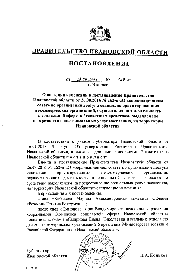 Постановление Правительства Ивановской области от 13.04.2017 N 137-п "О внесении изменений в постановление Правительства Ивановской области от 26.08.2016 N 262-п "О координационном совете по организации доступа социально ориентированных некоммерческих организаций, осуществляющих деятельность в социальной сфере, к бюджетным средствам, выделяемым на предоставление социальных услуг населению, на территории Ивановской области"