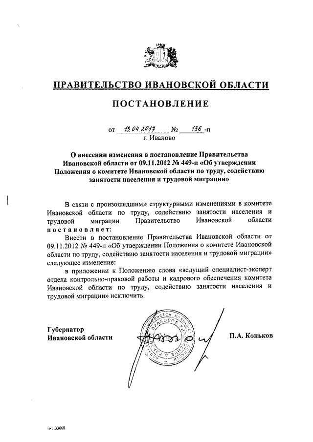 Постановление Правительства Ивановской области от 13.04.2017 N 136-п "О внесении изменения в постановление Правительства Ивановской области от 09.11.2012 N 449-п "Об утверждении Положения о комитете Ивановской области по труду, содействию занятости населения и трудовой миграции"