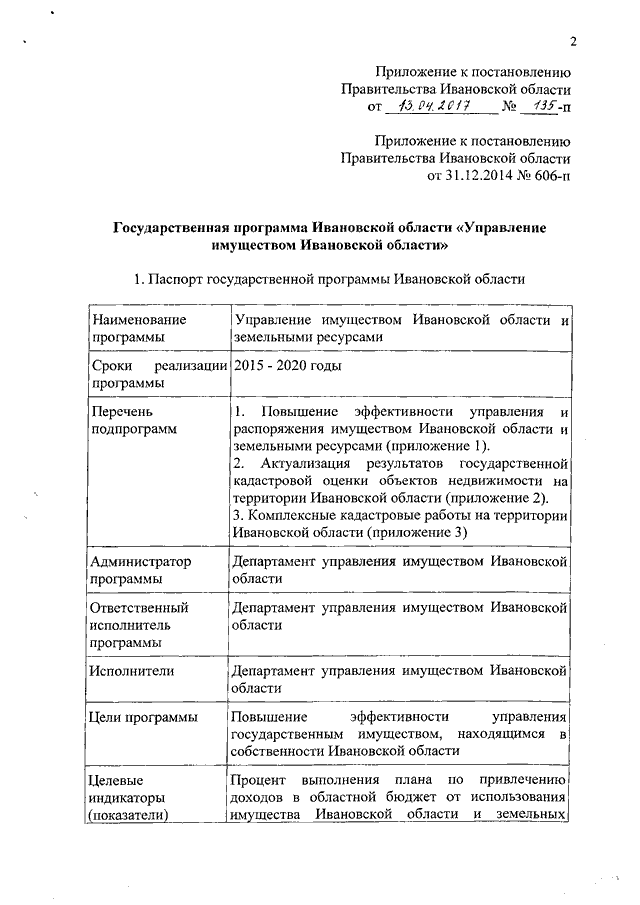 Постановление Правительства Ивановской области от 13.04.2017 N 135-п "О внесении изменения в постановление Правительства Ивановской области от 31.12.2014 N 606-п "Об утверждении государственной программы Ивановской области "Управление имуществом Ивановской области и земельными ресурсами"