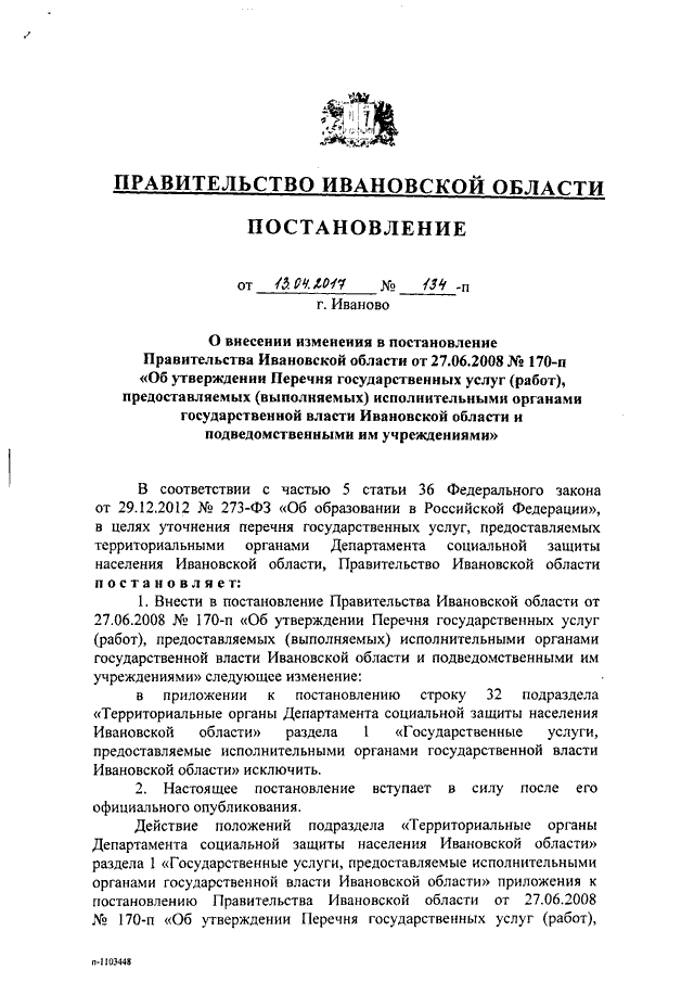 Постановление Правительства Ивановской области от 13.04.2017 N 134-п "О внесении изменения в постановление Правительства Ивановской области от 27.06.2008 N 170-п "Об утверждении Перечня государственных услуг (работ), предоставляемых (выполняемых) исполнительными органами государственной власти Ивановской области и подведомственными им учреждениями"