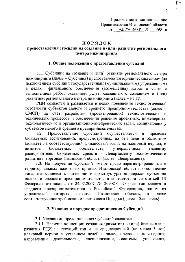 Постановление Правительства Ивановской области от 13.04.2017 N 133-п "Об утверждении Порядка предоставления субсидий на создание и (или) развитие регионального центра инжиниринга"
