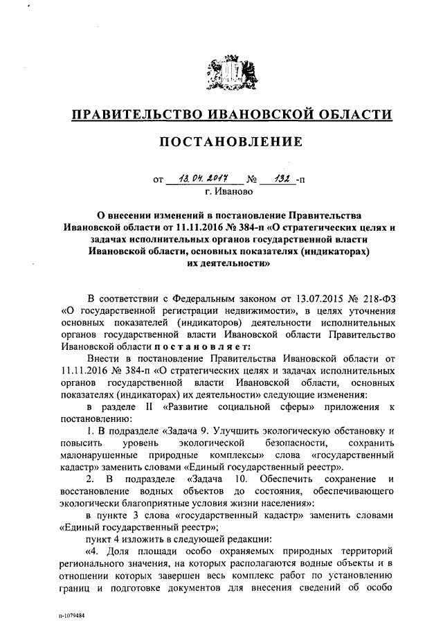 Постановление Правительства Ивановской области от 13.04.2017 N 132-п "О внесении изменений в постановление Правительства Ивановской области от 11.11.2016 N 384-п "О стратегических целях и задачах исполнительных органов государственной власти Ивановской области, основных показателях (индикаторах) их деятельности"