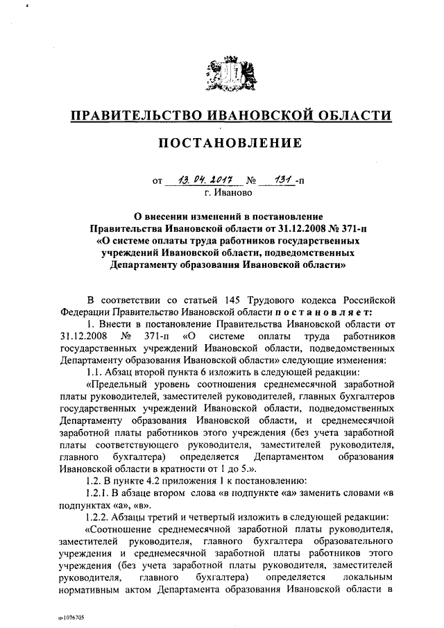 Постановление Правительства Ивановской области от 13.04.2017 N 131-п "О внесении изменений в постановление Правительства Ивановской области от 31.12.2008 N 371-п "О системе оплаты труда работников государственных учреждений Ивановской области, подведомственных Департаменту образования Ивановской области"