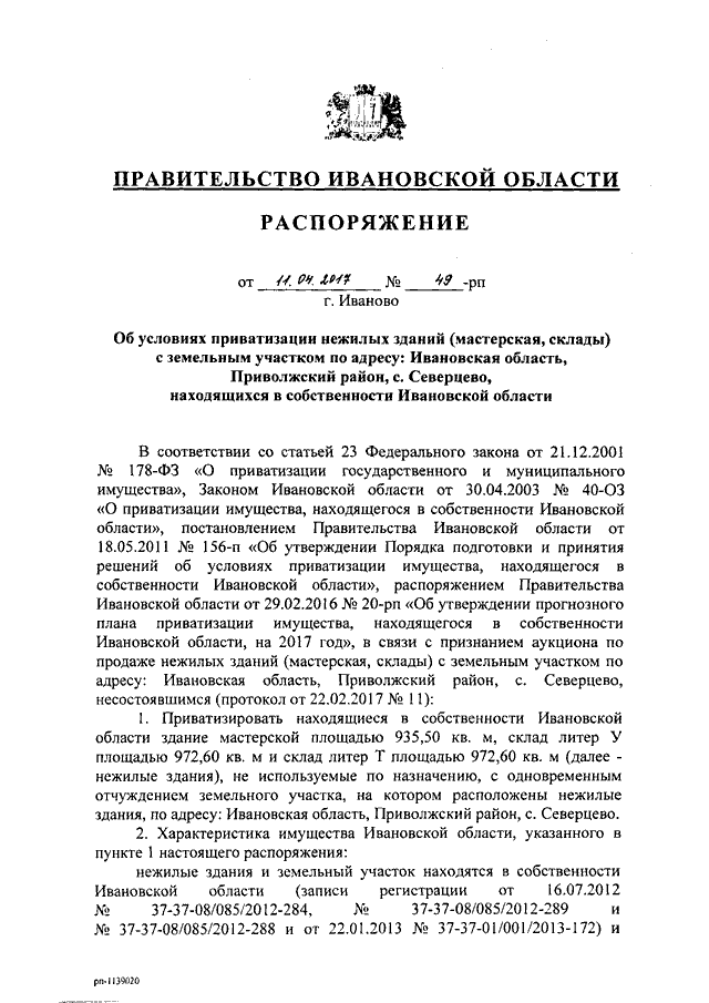 Распоряжение Правительства Ивановской области от 11.04.2017 N 49-рп "Об условиях приватизации нежилых зданий (мастерская, склады) с земельным участком по адресу: Ивановская область, Приволжский район, с. Северцево, находящихся в собственности Ивановской области"