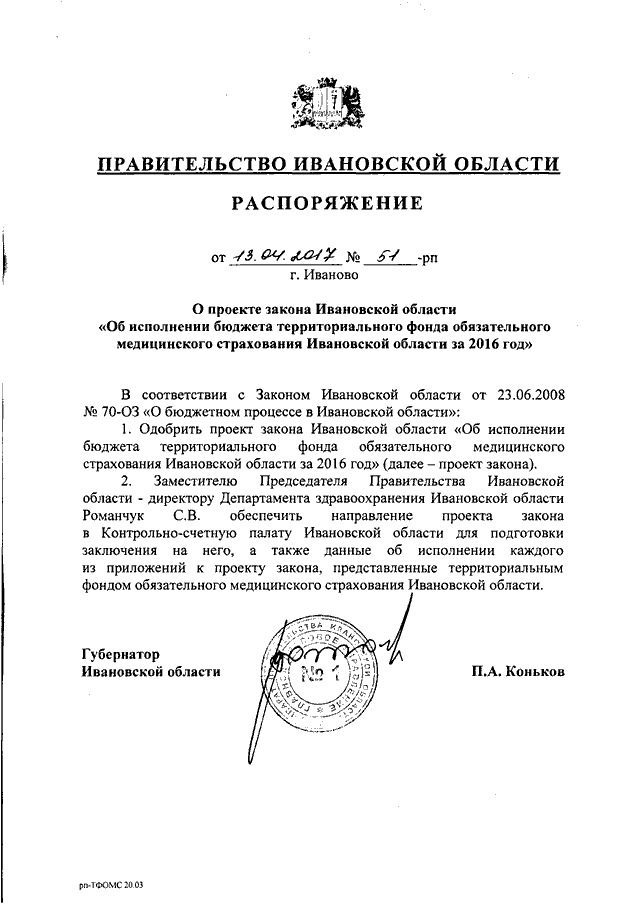 Распоряжение Правительства Ивановской области от 13.04.2017 N 51-рп "О проекте закона Ивановской области "Об исполнении бюджета территориального фонда обязательного медицинского страхования Ивановской области за 2016 год"
