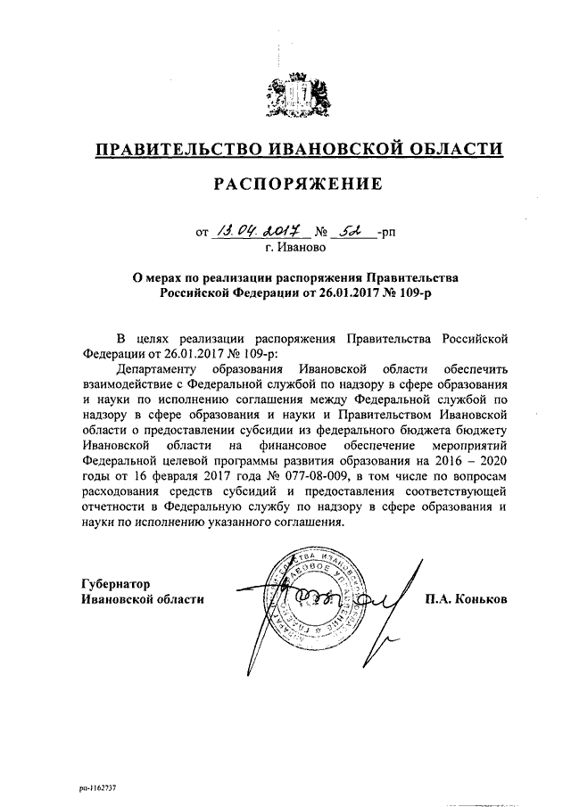 Распоряжение Правительства Ивановской области от 13.04.2017 N 52-рп "О мерах по реализации распоряжения Правительства Российской Федерации от 26.01.2017 N 109-р"