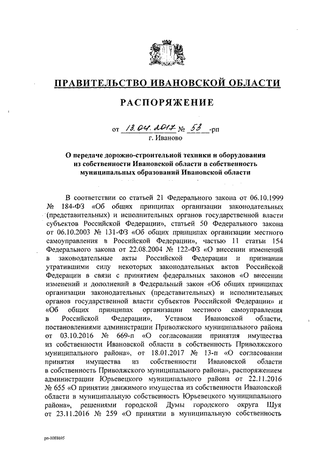 Распоряжение Правительства Ивановской области от 13.04.2017 N 53-рп "О передаче дорожно-строительной техники и оборудования из собственности Ивановской области в собственность муниципальных образований Ивановской области"