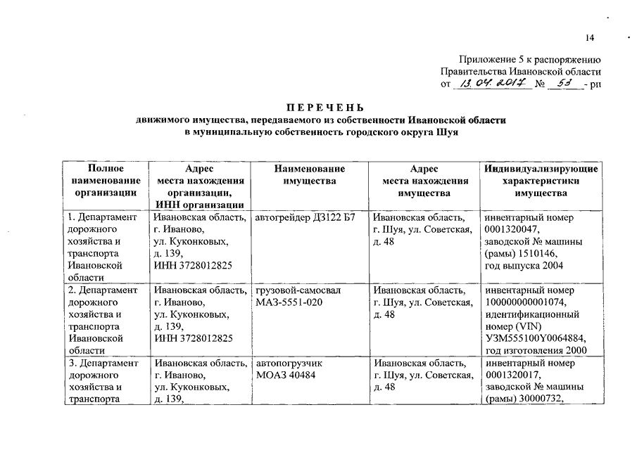 Распоряжение Правительства Ивановской области от 13.04.2017 N 53-рп "О передаче дорожно-строительной техники и оборудования из собственности Ивановской области в собственность муниципальных образований Ивановской области"