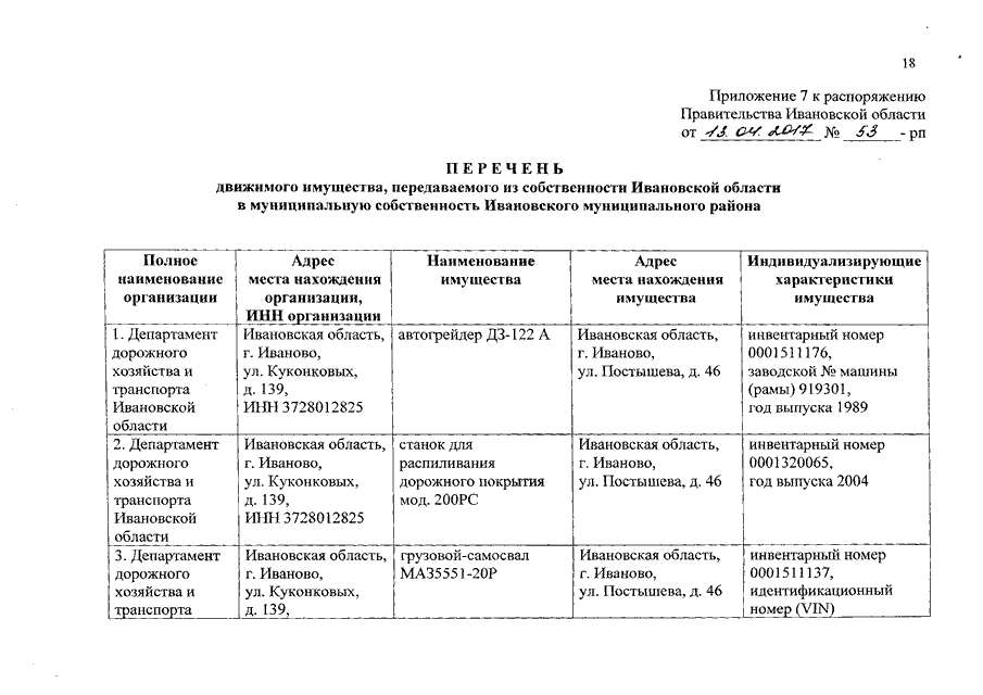 Распоряжение Правительства Ивановской области от 13.04.2017 N 53-рп "О передаче дорожно-строительной техники и оборудования из собственности Ивановской области в собственность муниципальных образований Ивановской области"
