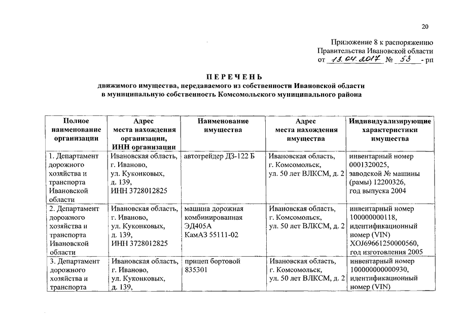 Распоряжение Правительства Ивановской области от 13.04.2017 N 53-рп "О передаче дорожно-строительной техники и оборудования из собственности Ивановской области в собственность муниципальных образований Ивановской области"