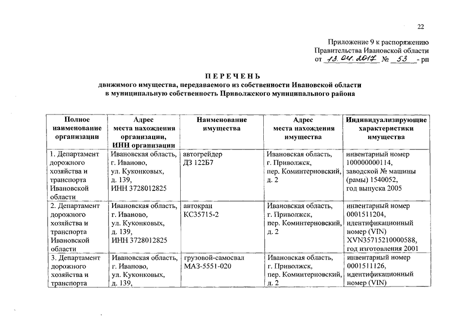 Распоряжение Правительства Ивановской области от 13.04.2017 N 53-рп "О передаче дорожно-строительной техники и оборудования из собственности Ивановской области в собственность муниципальных образований Ивановской области"