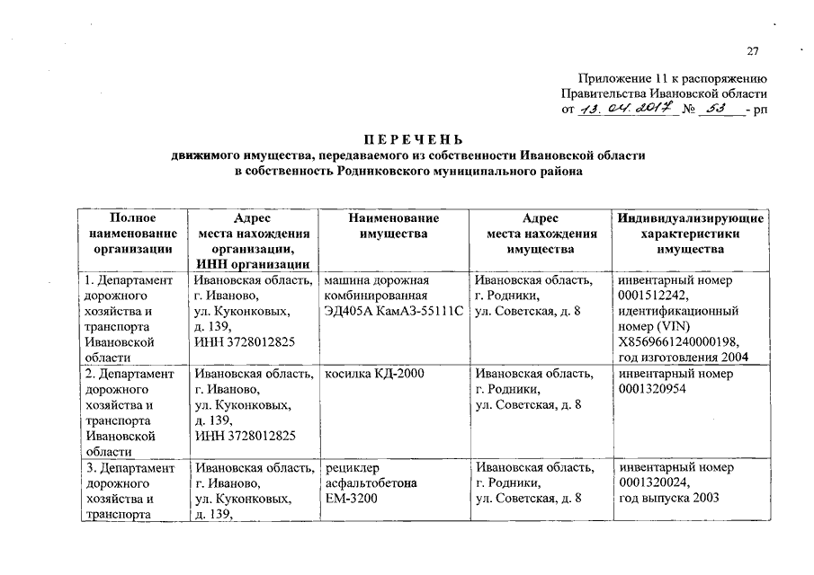 Распоряжение Правительства Ивановской области от 13.04.2017 N 53-рп "О передаче дорожно-строительной техники и оборудования из собственности Ивановской области в собственность муниципальных образований Ивановской области"