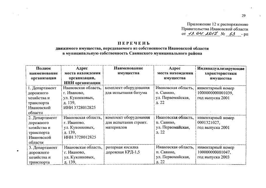 Распоряжение Правительства Ивановской области от 13.04.2017 N 53-рп "О передаче дорожно-строительной техники и оборудования из собственности Ивановской области в собственность муниципальных образований Ивановской области"