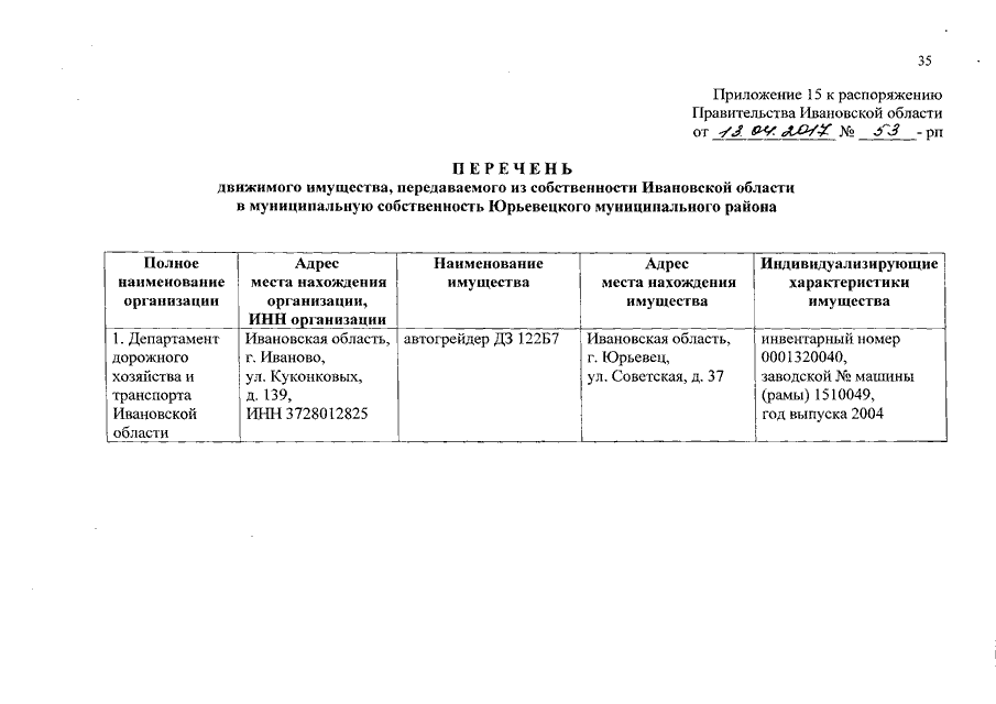 Распоряжение Правительства Ивановской области от 13.04.2017 N 53-рп "О передаче дорожно-строительной техники и оборудования из собственности Ивановской области в собственность муниципальных образований Ивановской области"