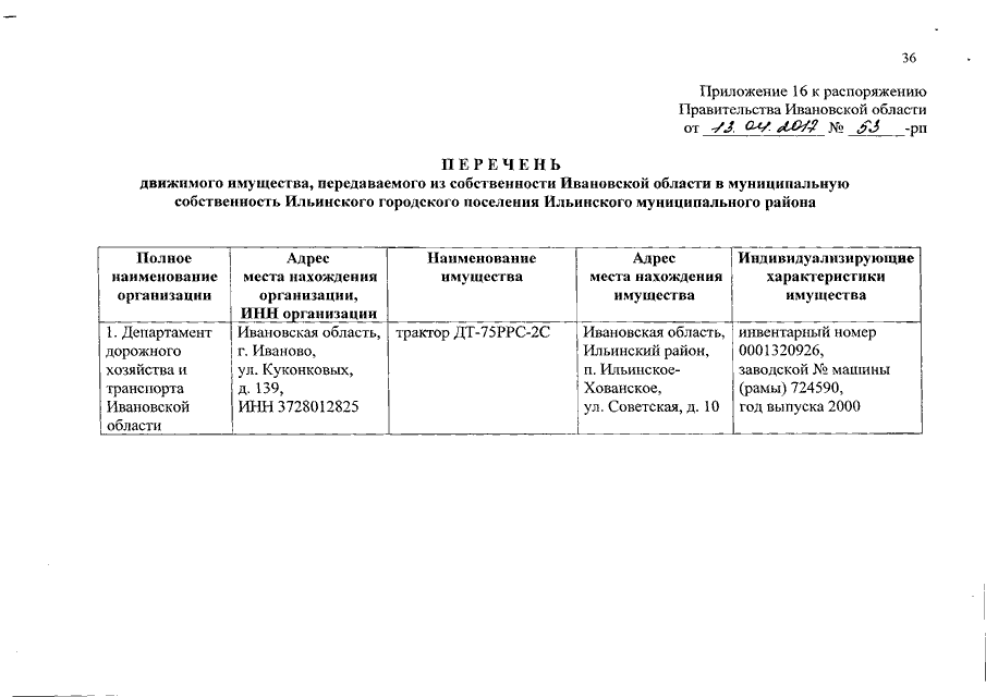 Распоряжение Правительства Ивановской области от 13.04.2017 N 53-рп "О передаче дорожно-строительной техники и оборудования из собственности Ивановской области в собственность муниципальных образований Ивановской области"