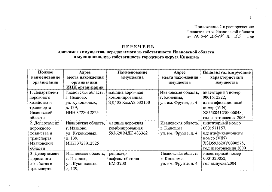 Распоряжение Правительства Ивановской области от 13.04.2017 N 53-рп "О передаче дорожно-строительной техники и оборудования из собственности Ивановской области в собственность муниципальных образований Ивановской области"