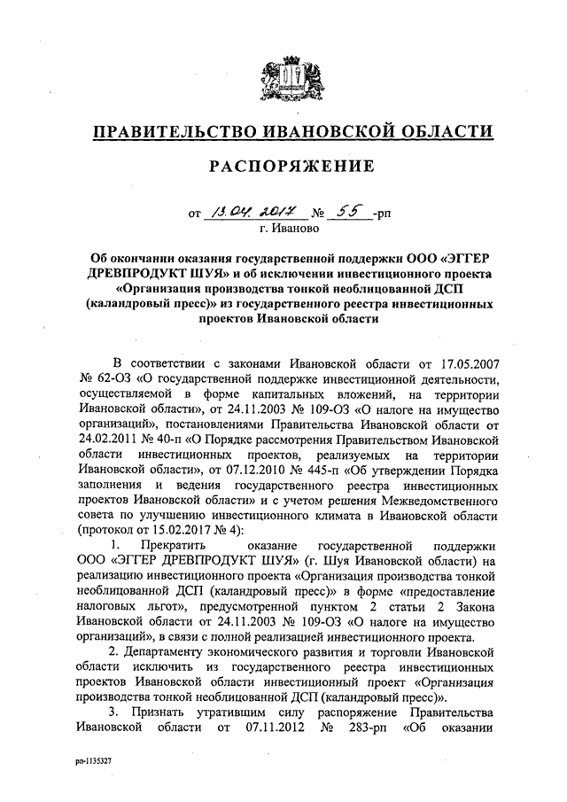 Распоряжение Правительства Ивановской области от 13.04.2017 N 55-рп "Об окончании оказания государственной поддержки ООО "ЭГГЕР ДРЕВПРОДУКТ ШУЯ" и об исключении инвестиционного проекта "Организация производства тонкой необлицованной ДСП (каландровый пресс)" из государственного реестра инвестиционных проектов Ивановской области"