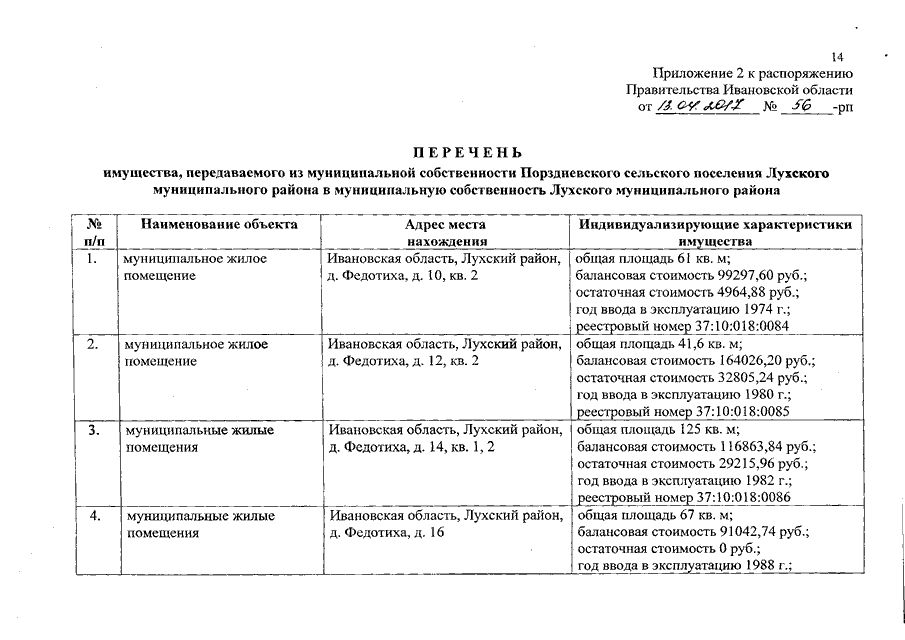 Распоряжение Правительства Ивановской области от 13.04.2017 N 56-рп "О разграничении имущества, находящегося в муниципальной собственности, между Лухским муниципальным районом и сельскими поселениями, входящими в его состав, в связи с изменением перечня вопросов местного значения сельского поселения"