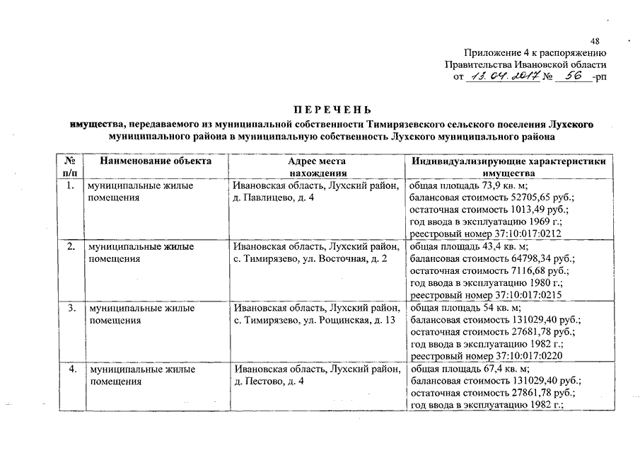 Распоряжение Правительства Ивановской области от 13.04.2017 N 56-рп "О разграничении имущества, находящегося в муниципальной собственности, между Лухским муниципальным районом и сельскими поселениями, входящими в его состав, в связи с изменением перечня вопросов местного значения сельского поселения"