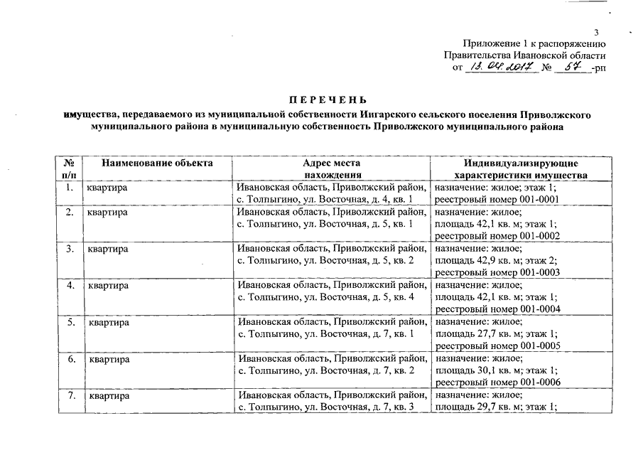 Распоряжение Правительства Ивановской области от 13.04.2017 N 57-рп "О разграничении имущества, находящегося в муниципальной собственности, между Приволжским муниципальным районом и сельскими поселениями, входящими в его состав, в связи с изменением перечня вопросов местного значения сельского поселения"