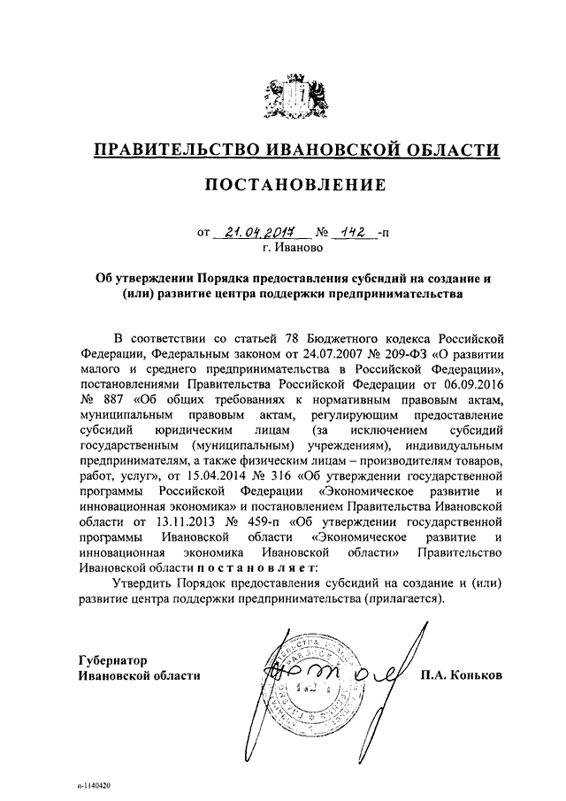 Постановление Правительства Ивановской области от 21.04.2017 N 142-п "Об утверждении Порядка предоставления субсидий на создание и (или) развитие центра поддержки предпринимательства"