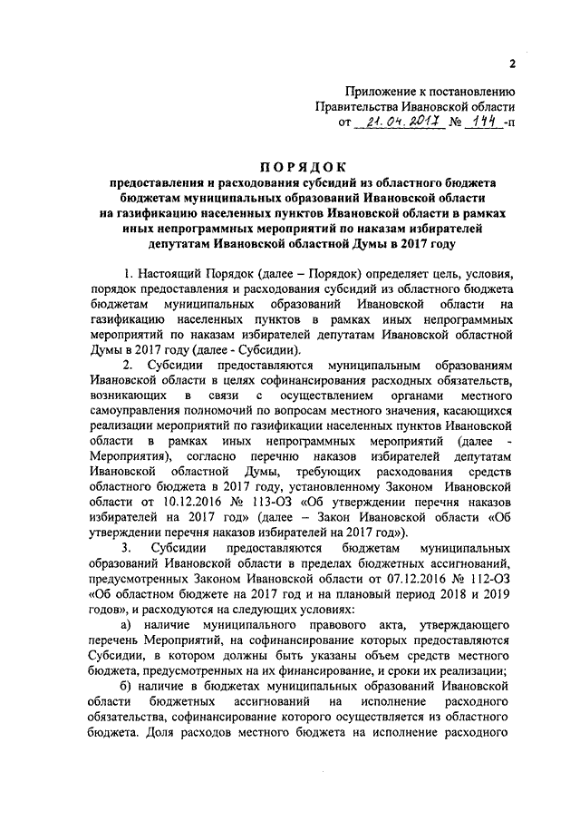 Постановление Правительства Ивановской области от 21.04.2017 N 144-п "Об утверждении Порядка предоставления и расходования субсидий из областного бюджета бюджетам муниципальных образований Ивановской области на газификацию населенных пунктов Ивановской области в рамках иных непрограммных мероприятий по наказам избирателей депутатам Ивановской областной Думы в 2017 году"