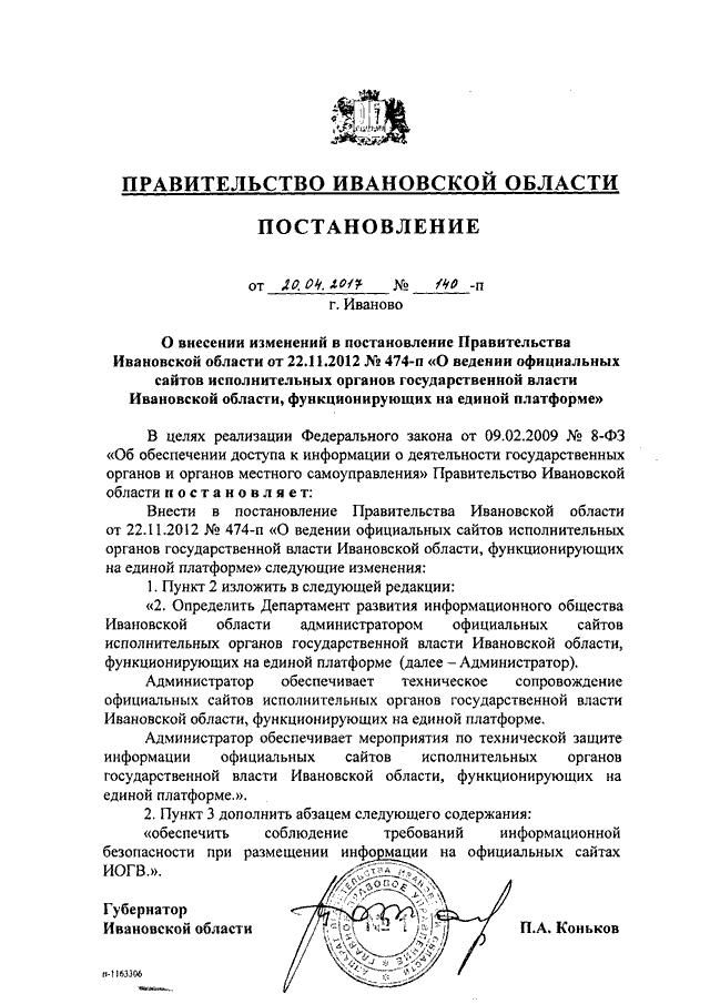 Постановление Правительства Ивановской области от 20.04.2017 N 140-п "О внесении изменений в постановление Правительства Ивановской области от 22.11.2012 N 474-п "О ведении официальных сайтов исполнительных органов государственной власти Ивановской области, функционирующих на единой платформе"
