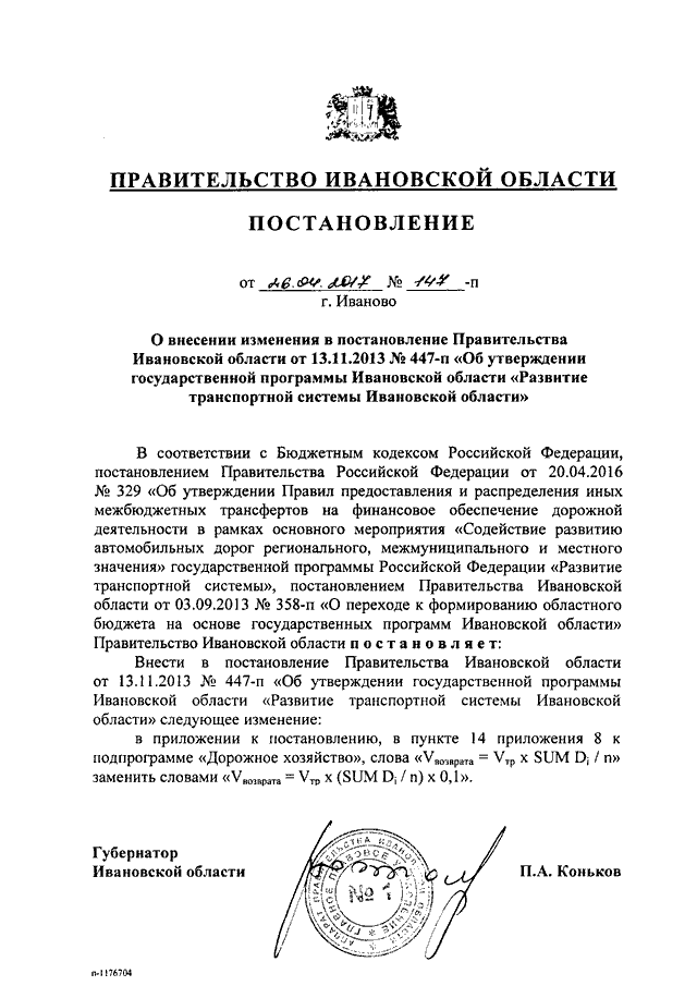 Постановление Правительства Ивановской области от 26.04.2017 N 147-п "О внесении изменения в постановление Правительства Ивановской области от 13.11.2013 N 447-п "Об утверждении государственной программы Ивановской области "Развитие транспортной системы Ивановской области"