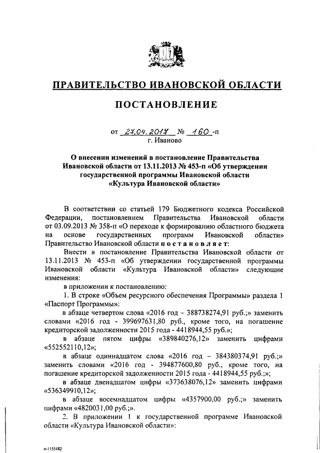 Постановление Правительства Ивановской области от 27.04.2017 N 160-п "О внесении изменений в постановление Правительства Ивановской области от 13.11.2013 N 453-п "Об утверждении государственной программы Ивановской области "Культура Ивановской области"