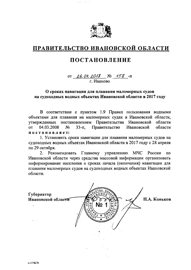Постановление Правительства Ивановской области от 26.04.2017 N 158-п "О сроках навигации для плавания маломерных судов на судоходных водных объектах Ивановской области в 2017 году"